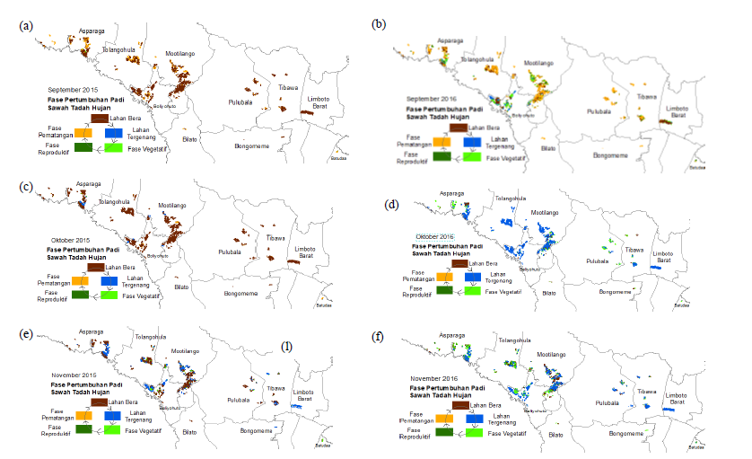 This paper examines the impact of the El Nino climate on changes in the phase of rainfed lowland rice in Gorontalo Regency. To see the impact of the El Nino climate (in 2015) well, the year for the absence of El Nino (in 2016) is used as a comparison. Landsat 7 and landsat 8 images were used to analyze the growth phase of rainfed lowland rice by combining NDVI and TCT methods. The results of this study indicate that there has been a shift in cropping patterns resulting in a shift in the growth phase of rainfed lowland rice. Seen in September 2015 until October 2015, most of the wetland conditions were in fallow conditions, which then continued until February 2016, but the extent of fallow land conditions has been decreasing since January 2016 to February 2016. Unlike in September 2016 Until October 2016, most of the land was in stagnant conditions which showed farmers were preparing to plant rice. Finally in December 2016 until January 2017, the rice phase has been in the reproductive phase and maturation phase, whereas in El Nino years only in January 2016 to February 2016 are in the reproductive phase and maturation phase.